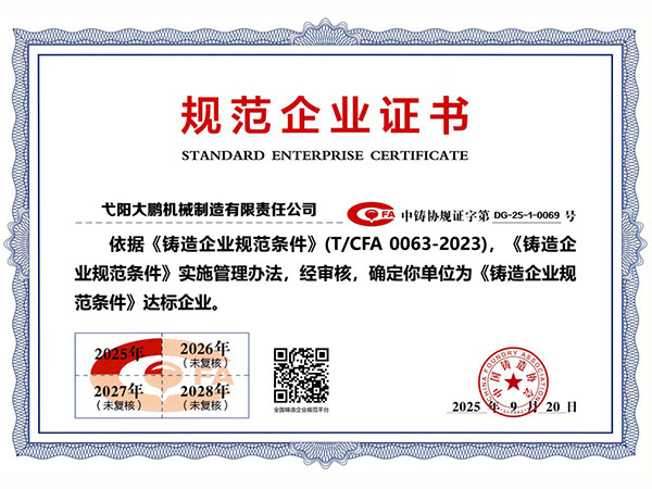 公司順利通過質量管理體系認證、環(huán)境體系認證、職業(yè)健康安全管理體系認證、環(huán)評。2015年5月獲國家工信委頒發(fā)的《鑄造企業(yè)準入條件》;2019年做了安全現(xiàn)狀評價;2020年取得了排污許可證。
